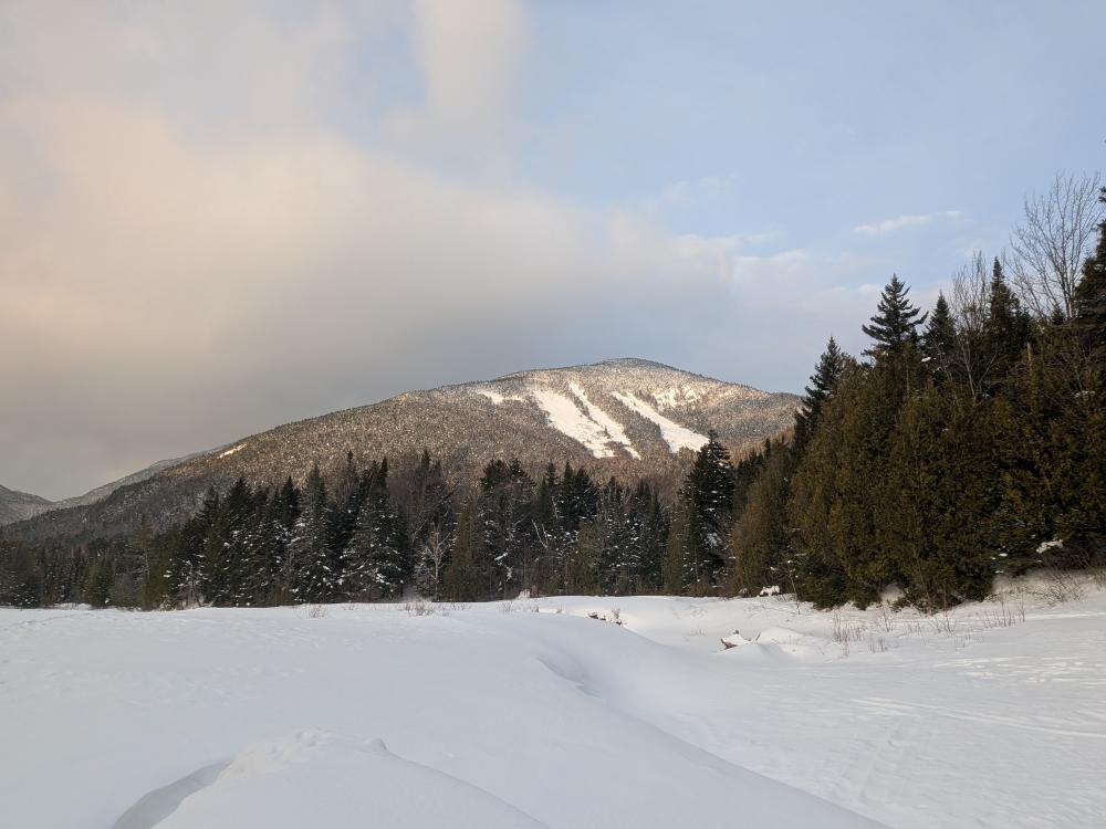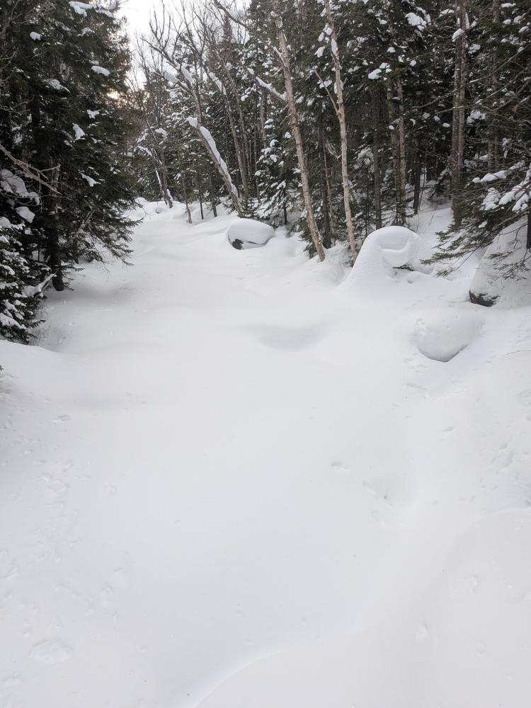 The hike in was pretty good. The trails to to Lake Arnold were rather solid. After that they were a little softer, but still well packed. It was while we were on that Lake Arnold trail, and the start of our time on the Marcy trail where it snowed, and it wasn't a nice snow, it was more like sleet and grauple. It didn't amount to much thankfully.
