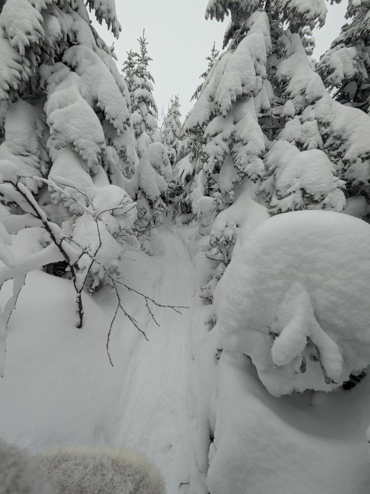 We then passed many many groups of people on the way out. Most were wearing snowshoes, 2 were just in spikes, but the trail at this point is firmly packed down, so they weren't doing any damage unless they stepped off the side of the trench.... but legally, when you start the climbing, we're well over 8 inches so snowshoes are required.