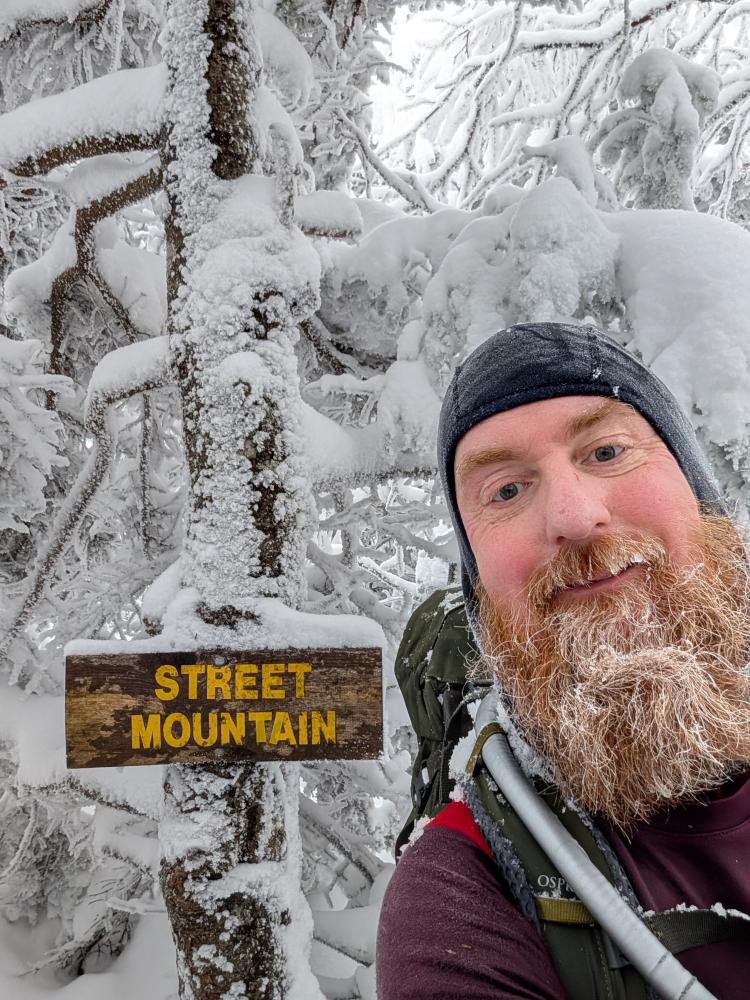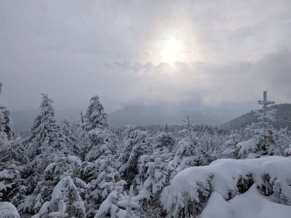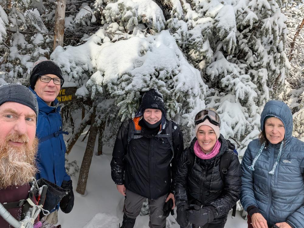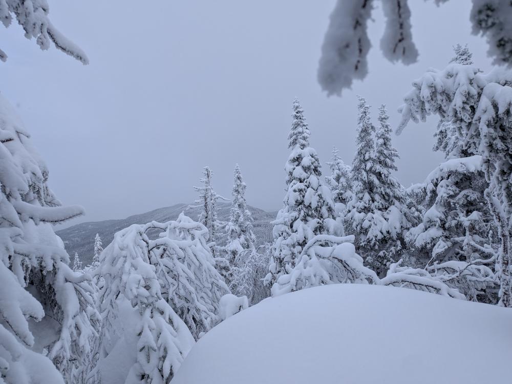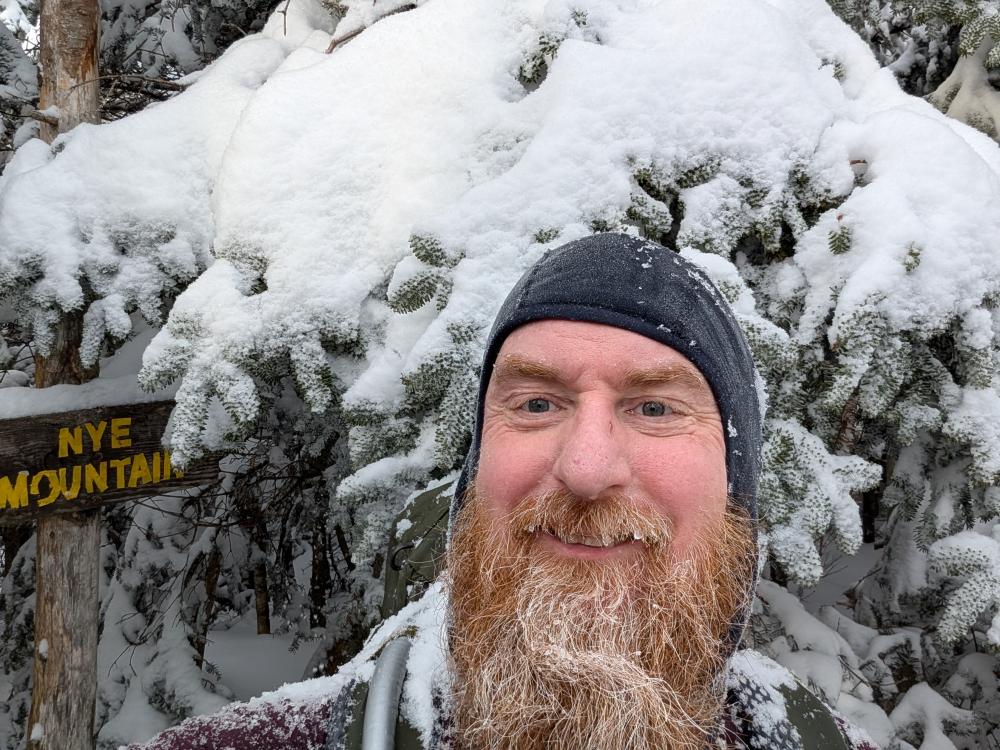 From there, we start to climb. The trail was getting deeper, but we didn't have more than a couple inches of fresh stuff to break. After a slow ascent up the transition from valley to shoulder, the steepest section of trail, we were shortly at the split in the trail. We chose to do Nye first, and in a few minutes we were at the viewpoint, with the top of the MacIntyres cut off by the clouds. A quick jaunt over to the sign, and then back down to the col, and up Street.