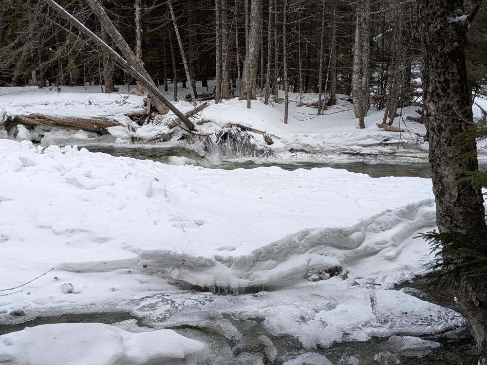 The trails were pretty good overall. As expected the hike in to Marcy Dam was quick and solid. A couple wet spots and a couple blow downs, but nothing bad. We did snowshoes the whole day, but this section could have been spikes most of the way. The Avalanche Pass trail to Avalanche Camp was not that bad either, but the snow was getting thicker. By the time we got to the still closed trail to Avalanche Pass and turned up to Lake Arnold, the snow depth was enough to be legally required without question. This was solid though, and there were a few wet spots on the climb. Much better than going up this trail in the summer though... no rocks! Then we turned off to go up Colden. The snow here was not as well packed, getting soft in spots. Thankfully only a couple small blowdowns to get around.