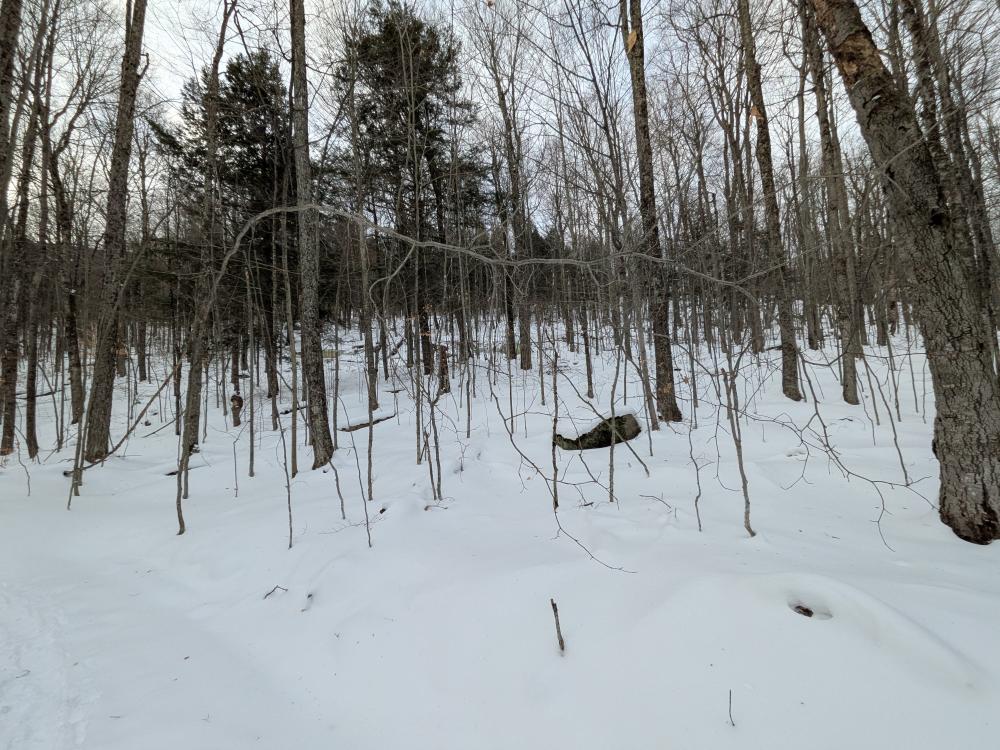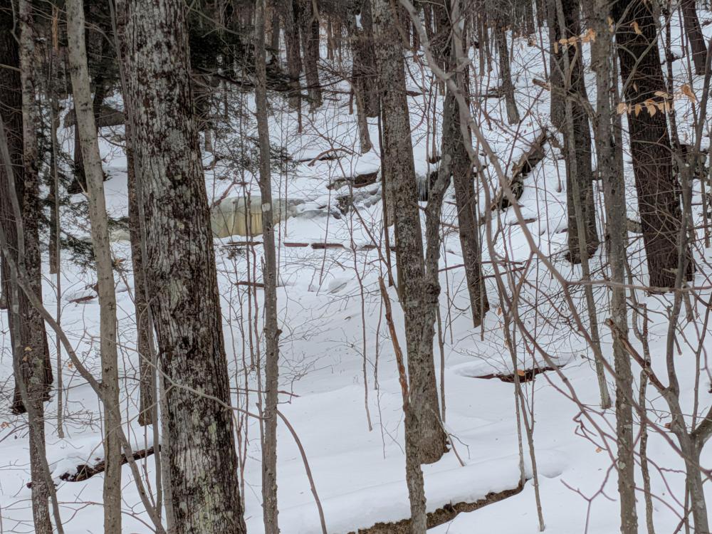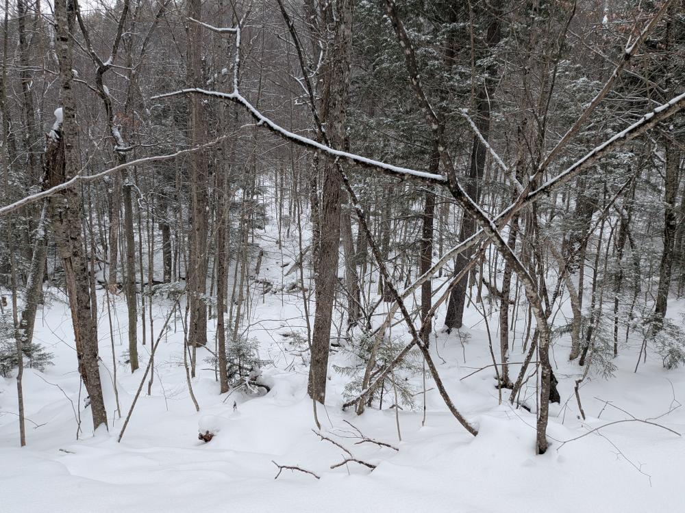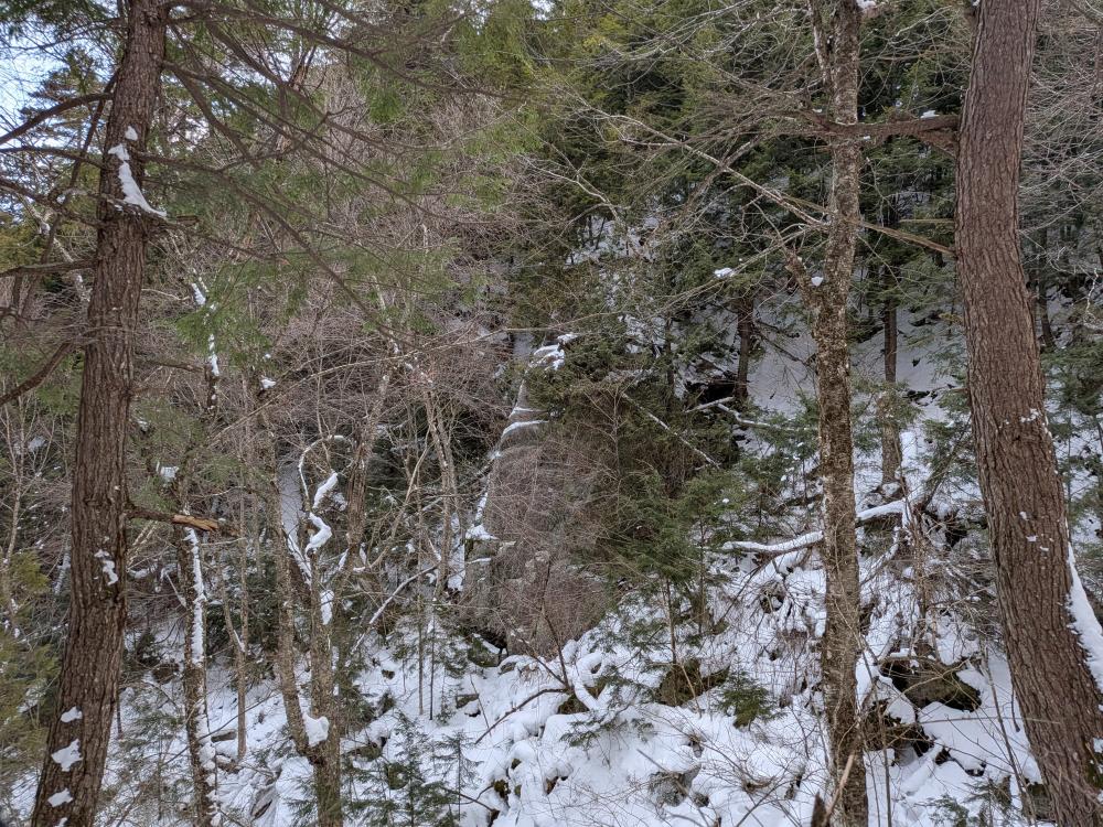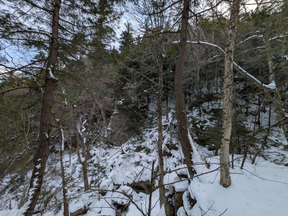 Coming down the other side was fun. There are a few ledges and drops to navigate around, but the mile down to the Old Dix trail is pretty nice compared to the difficult climb up. Similarly, the hike out on the Old Dix trail is lovely. There are a couple wet spots that did cause balling on our shoes, but nothing major. Such a beautiful forest to walk through, especially in winter.
