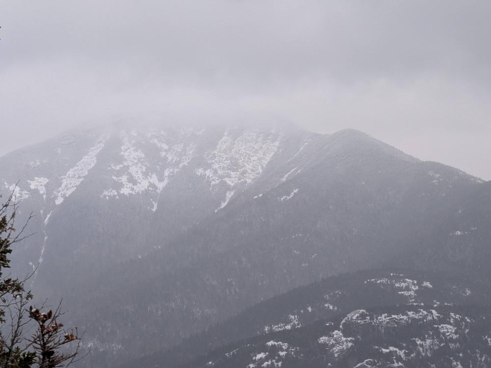 We started off, barebooting on the road to the trail register. At that point, the driveways were not recently plowed and they looked like 4 or 5 inches of snow, so we decided to save the weight on our backs and put our snowshoes on there, and they stayed on until we got back. There was a group before us that was microspiking it, and did so about 1/3 of the way up the Stimson trail. I was comfortable with the shoes and was glad to have them on some of the initial steep sections. The snow cover varied. There were points where there was a couple inches, then drifts of a foot or more. It was generally a light, unconsolidated snow though, which on the steep sections started to cause issues. Unfortunately, by the time we got to the first viewpoint, it was starting to snow, and when we got on top, there was absolutely no view due to the snow, and plenty of wind. It got bad enough I had to put up the balaclava. What can I say, I hike hot.