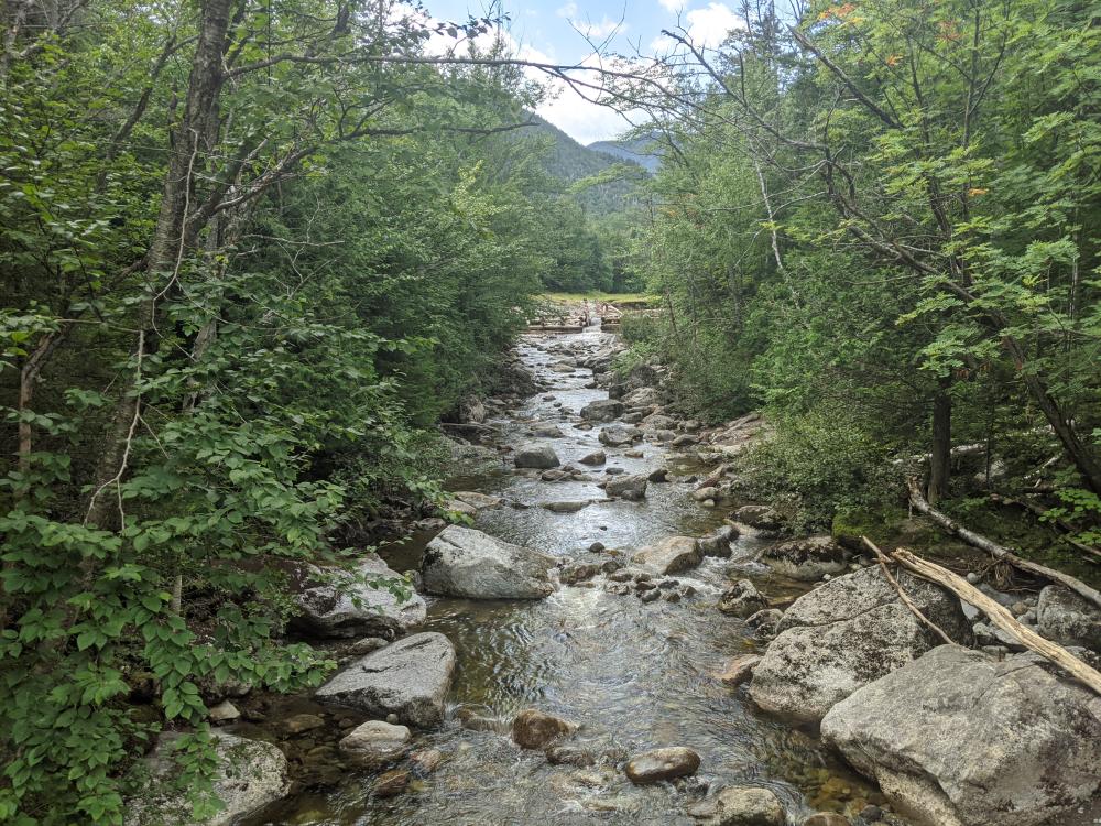 Tuesday, it rained all day, so I did the 2 peaks that have little to no views, Nye (3895', #45) and Street (4166', # 31). There really is not much to report on these... the herd path was decent, and the tops were treed in with a little bit of a viewing area just before the top of Nye. When I came back though, the one river I crossed going up had raised a few inches. This mean that a couple rocks I used to get over were a couple inches under water. Ut Oh! I did find a way across, and my boots only got a little wet. I was soaked though, not from rain, but from sweat. The hot shower that night felt amazing because of it.