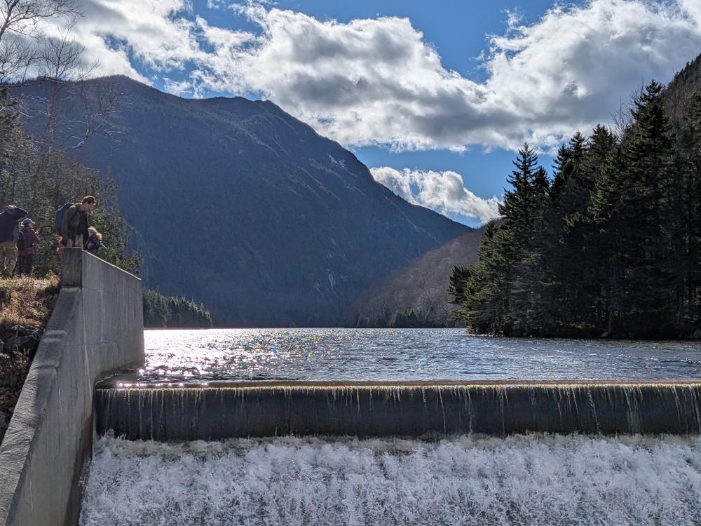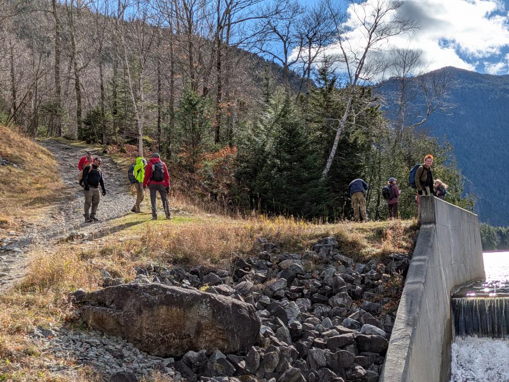 After a bit of relaxing on the ledges, it was back up to the top and then down the short way to the road. I offered that leaving packs at that point was ok, warning we were going to be going down a steep road that we'll have to come back up. Nobody took me up on that. So, it was off to the dam, and the great views from there, and then to the junction of the Weld and Rainbow falls trail. Most of us went up the short climb on Weld to the "Don't be a dropout" sign and overlook of the falls. Then down we went and in to the bottom of Rainbow Falls, which always impresses. If I am in that part of AMR property, I never skip seeing the falls if I have enough daylight. They are impressive.