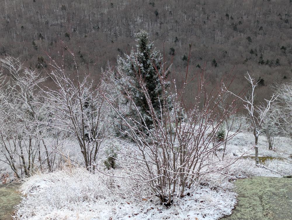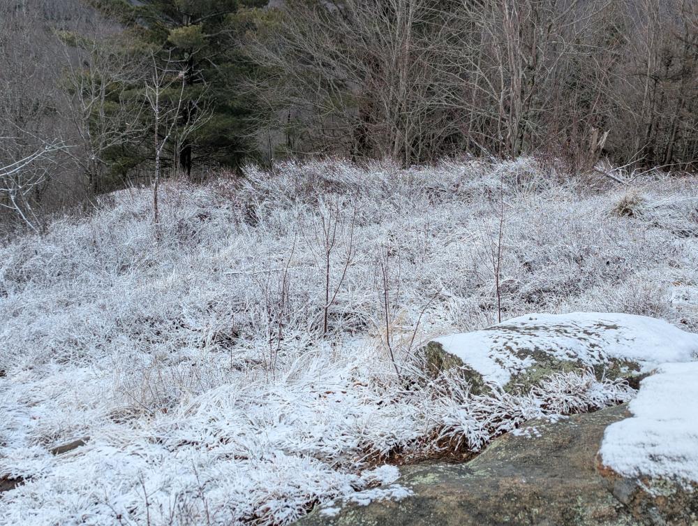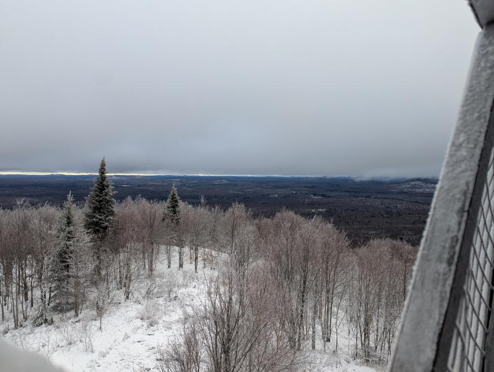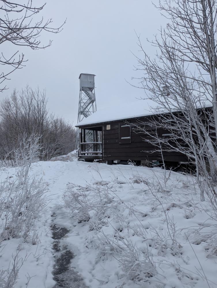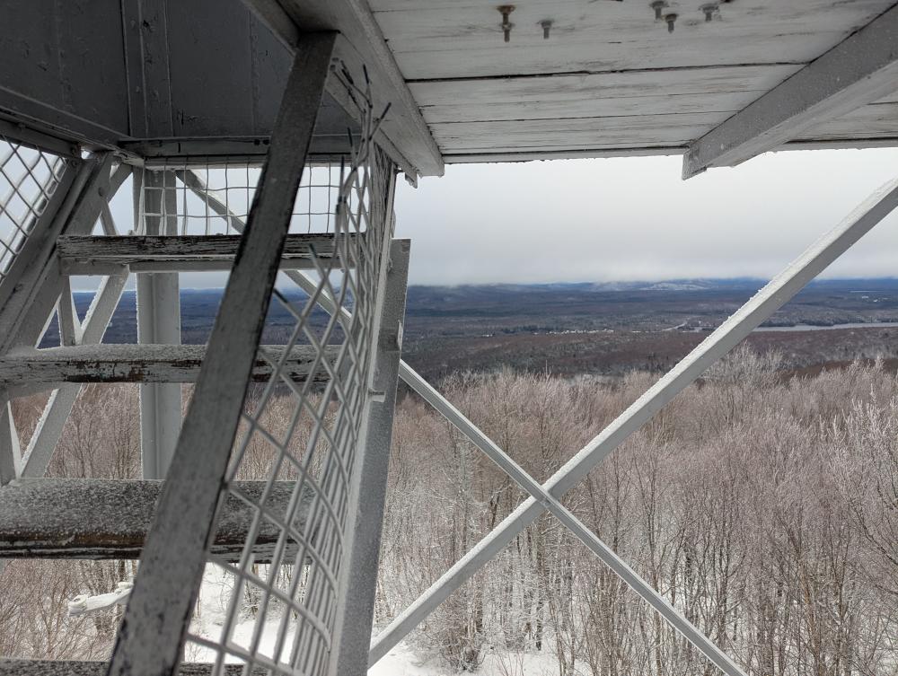 First up was Mt. Arab Fire Tower. The drive in was fun in that it was snowing and some of the roads were a little slick, but it wasn't that bad a drive in. I got to the lot and asked myself if I should really go hiking as I wasn't really feeling it. Well, I went anyways and felt better by the time I got to the top. The trail was reasonable, nothing bad. I did see some coyote tracks on the way up, but didn't see any of the animals. When I got to the top, the tower was frozen. One of the windows was open and I was able to see out of it... the others though were frosted over and frozen shut.... thankfully views from just below the cab were beautiful. I took an alternative trail around the top and found a beautiful bench looking over the valley... in the middle of the summer, this would be absolutely lovely.