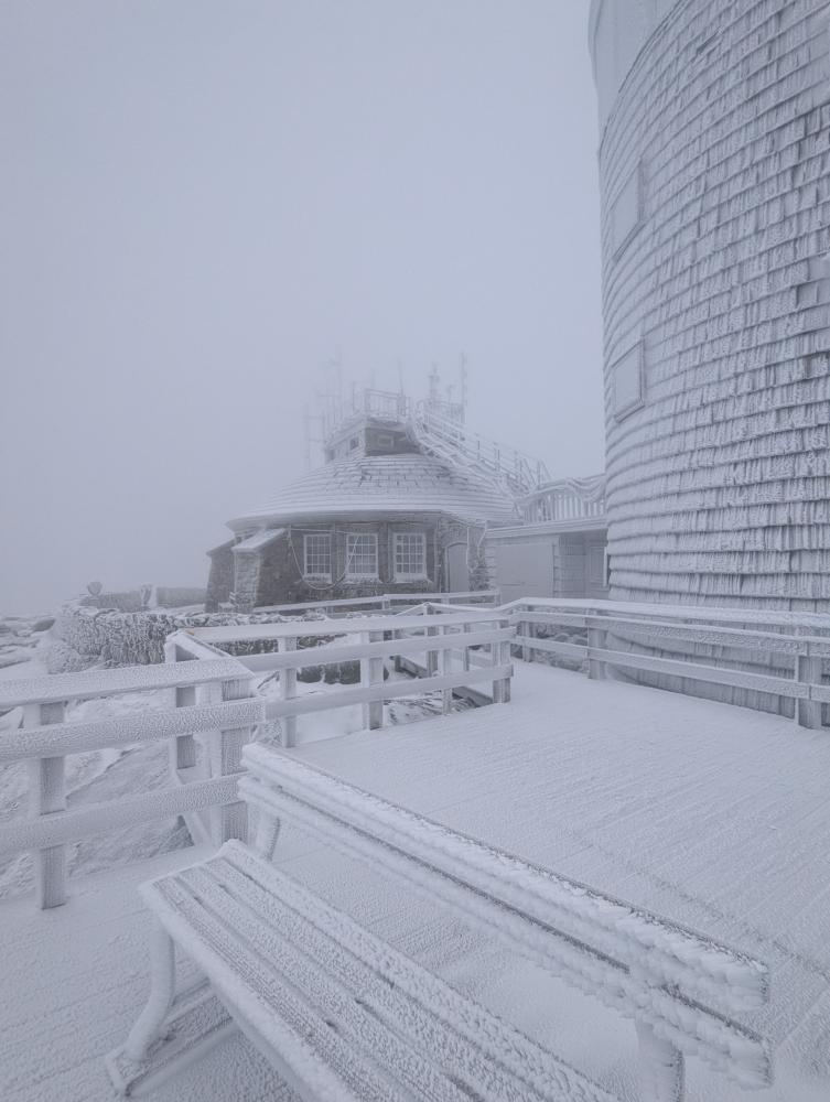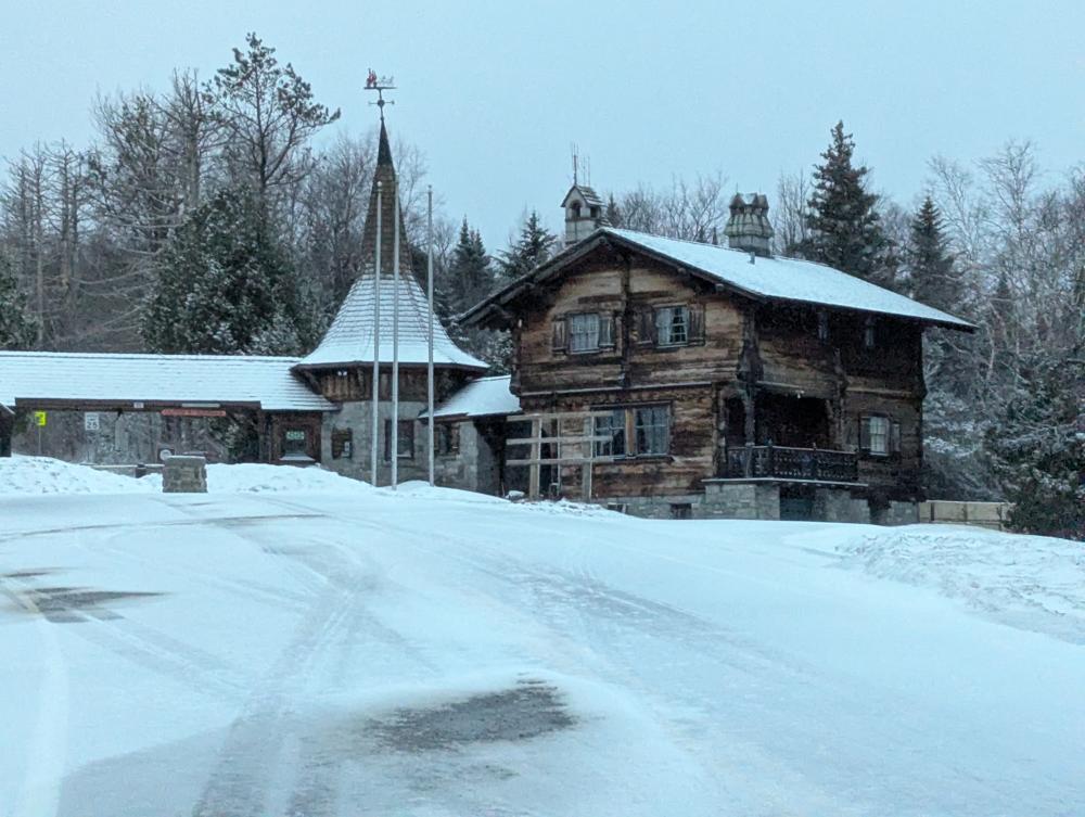 Sorry to say this skiers, the road has everything including a lot of bare pavement (or just barely iced over pavement). There were also spots with 4 foot high drifts. Unfortunately for me, the hike up was in the morning, and all the views were of cloud. I got to the "Wilmington Turn" and briefly considered going up the trail for the last half mile, but the wind was so hard on the road, so I decided to play it safe and go up the road. Dropped the pack at the castle, changed over to spikes and walked up the stairs, feeling grateful that I had railings to keep me from blowing away. I made it to the top to absolutely glorious views of cloud. Thankfully I've been up before in good weather, but still sucks.
