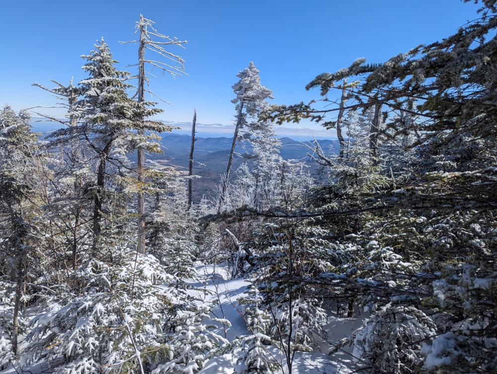 The trail is heavily post holed and the monorail is 2 feet wide in some spots and 4 inches wide in others. Some of the post holes are sprung spruce traps, so they're deep, but they're only the size of a boot. I honestly don't know how people get any enjoyment hiking like that. It's perfectly legal there though as these 2 mountains are not in the High Peaks Wilderness, so there is no snowshoe requirement.
